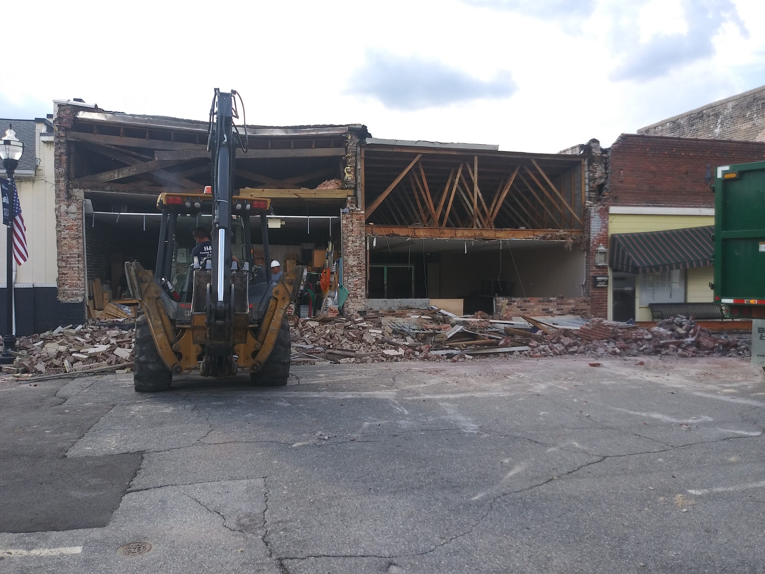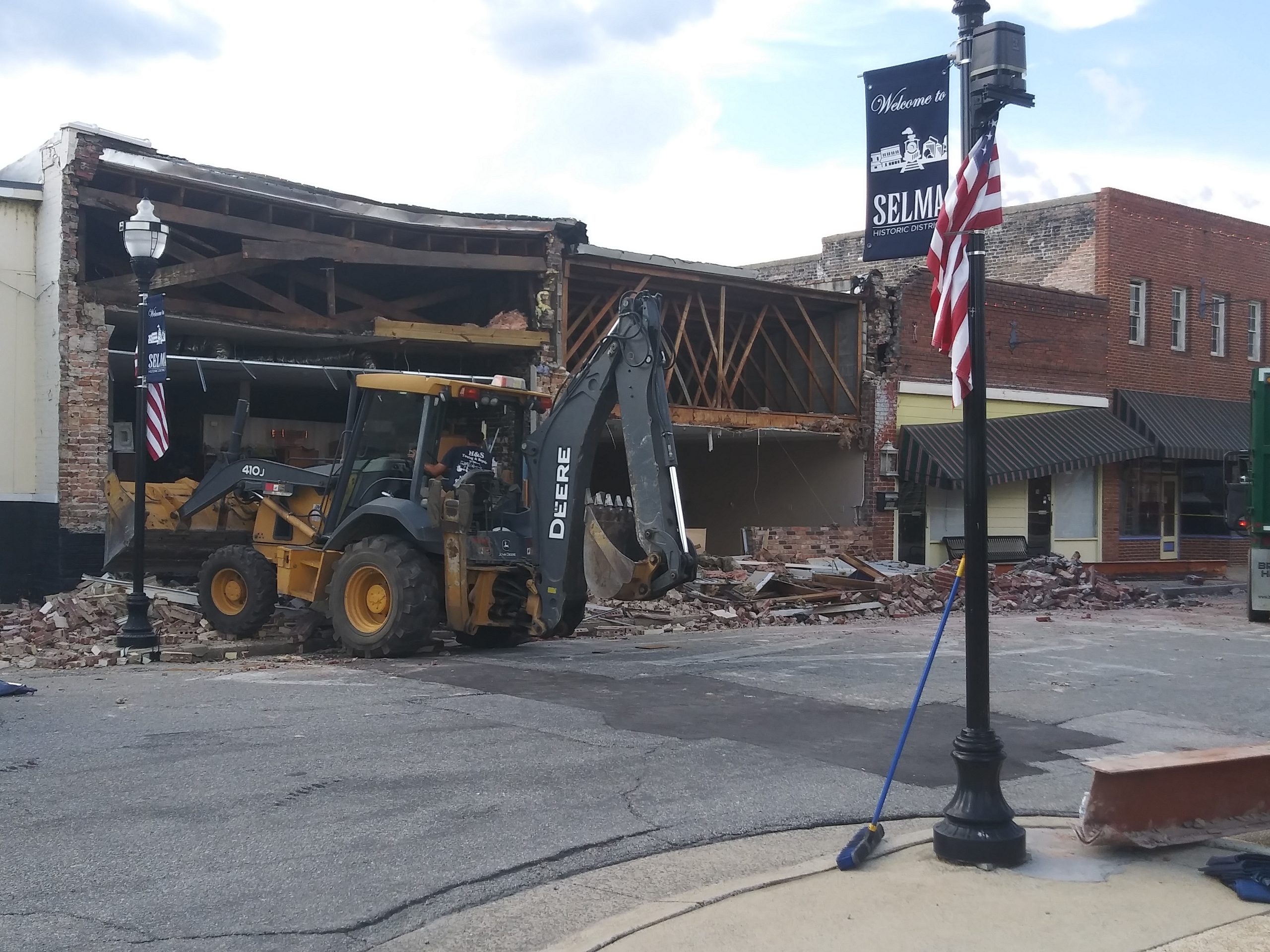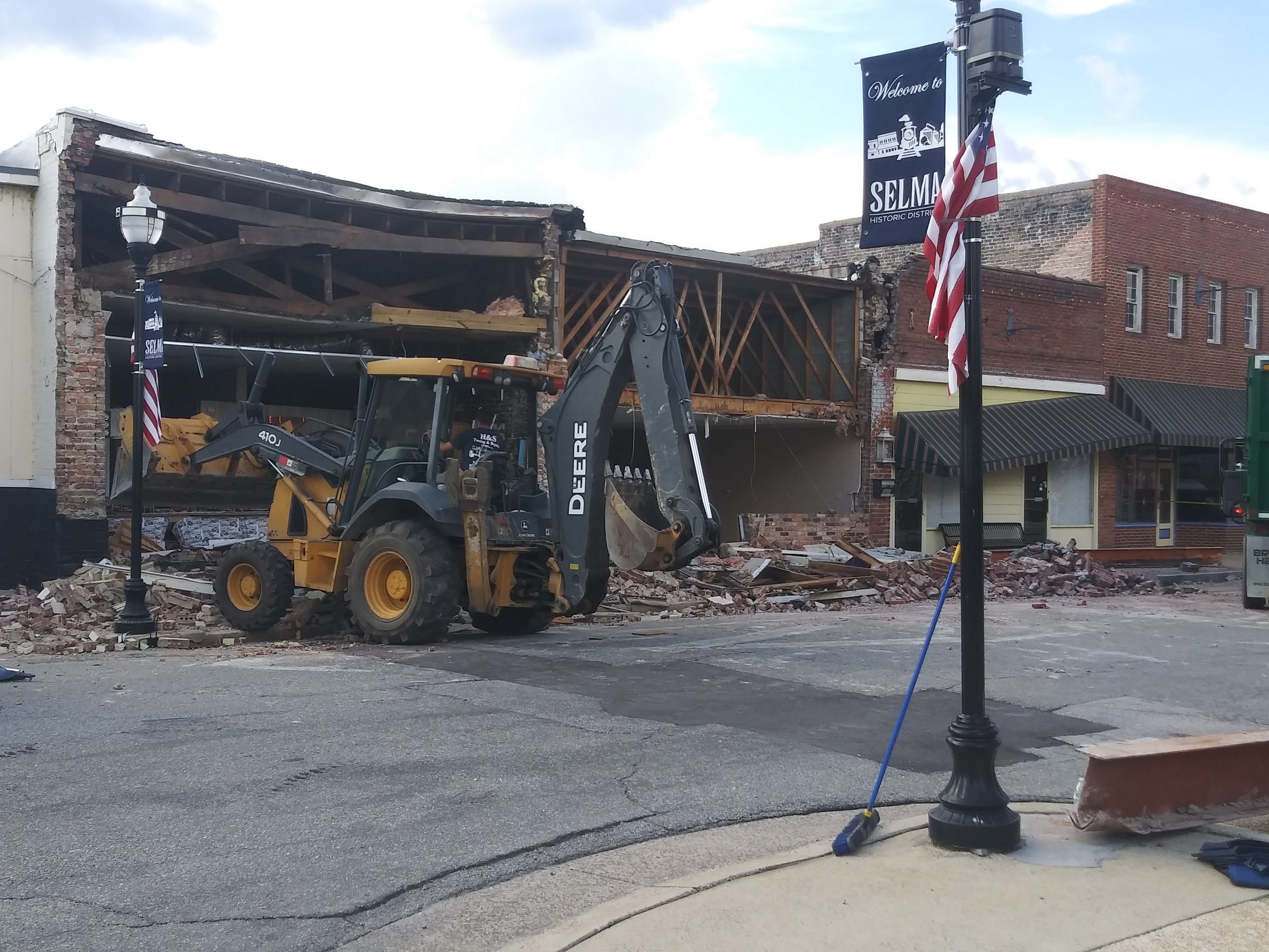 The Selma and Pine Level Fire Departments responded and stood by while the cleanup took place. Town of Selma crews used a backhoe to clear bricks, wood, and other debris from the roadway and sidewalk.
