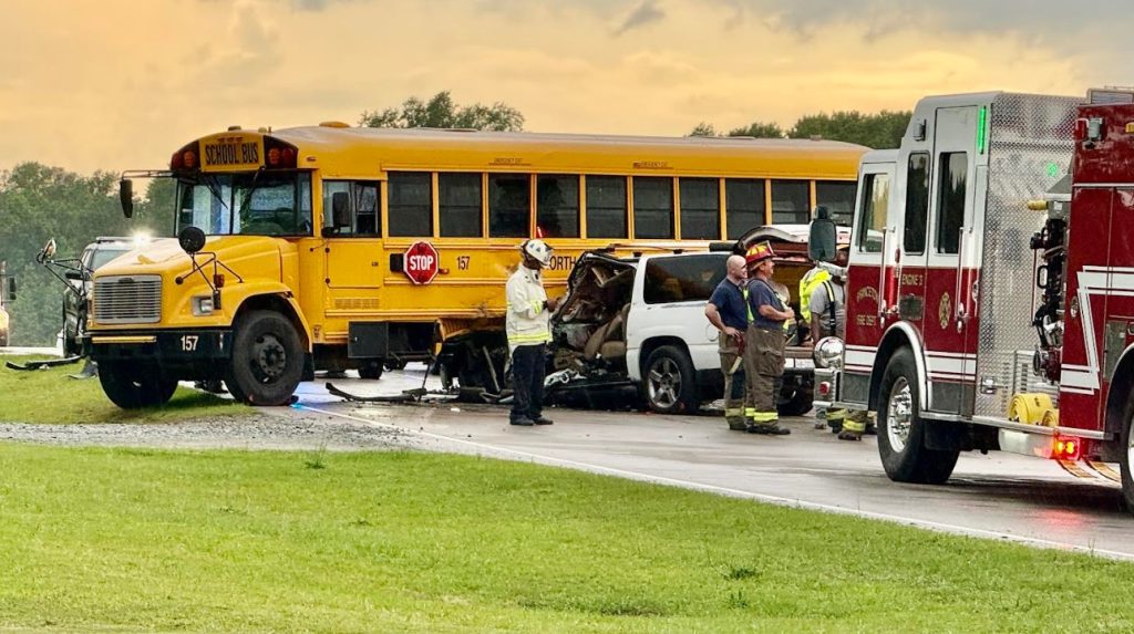 The two vehicle collision occurred around 3:30pm and involved Johnston County school bus number 157 and a white SUV. Numerous emergency vehicles rushed to the scene.