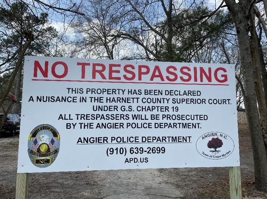 All parties were able to reach a settlement agreement. This agreement allowed the properties to remain under current ownership and granted the Angier Police Department full authority to go upon the properties and trespass any violators. A responsible family member will supervise the properties and ensure signs remain posted advising the properties are closed.