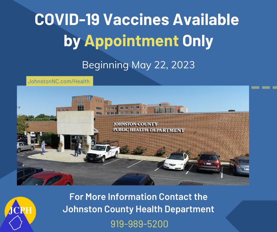 SMITHFIELD – COVID-19 vaccines will be available by appointment only at the Johnston County Public Health Department beginning Monday, May 22.