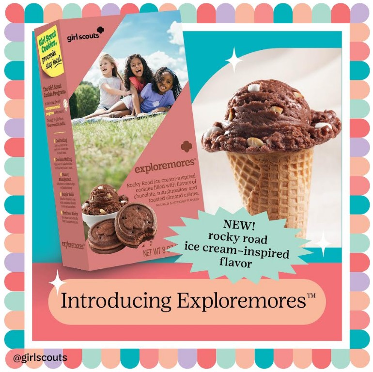 RALEIGH – Girl Scouts – North Carolina Coastal Pines has announced that Exploremores, a rocky road ice cream–inspired sandwich cookie, will join the lineup for the 2026 Girl Scout Cookie season. Filled with delicious flavors of chocolate, marshmallow and toasted almond–flavored crème, Exploremores reflect the spirit of exploration at the heart of every Girl Scout.