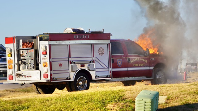 An Archer Lodge fire truck being transported back to the Fire Station on Covered Bridge Road suddenly burst into flames when stopped at the intersection of Highway 42 East and…