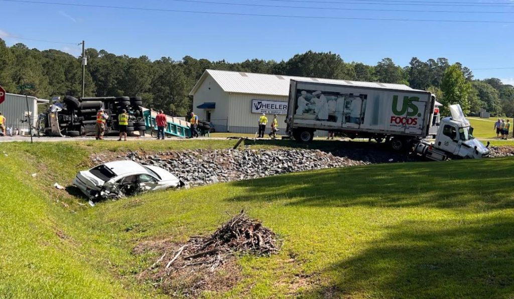 The accident involved two tractor trailers and a white passenger car.
