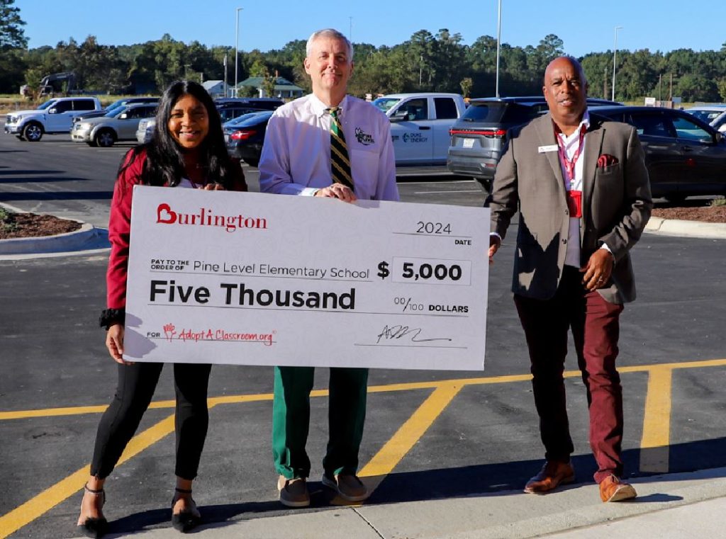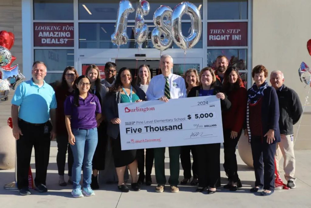 As part of the collaboration, Burlington Stores recognized the closest Title 1 school in the district to the new store, Pine Level Elementary, and provided the donation to support the educational efforts of the school.