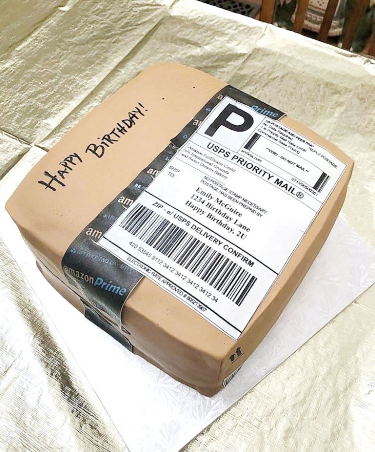 The cake was complete with Amazon’s packing tape, a UPS shipping label, the internationally known logo and a unique address. The cake’s address was 1234 Birthday Lane.
