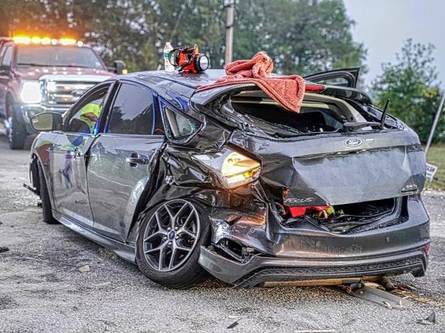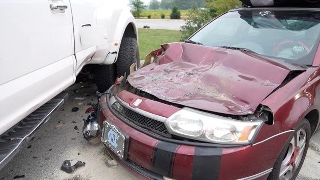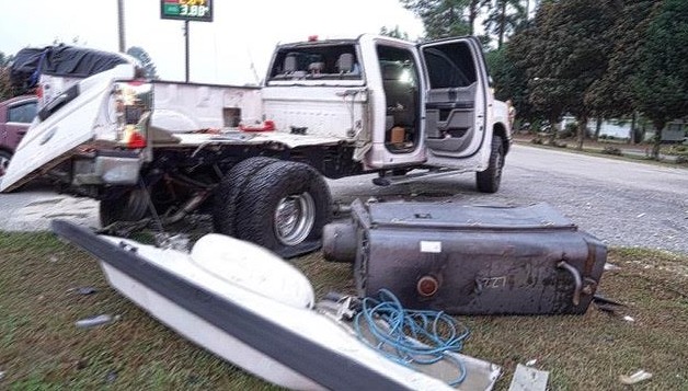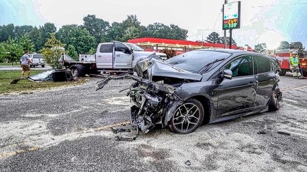 The crash happened around 5:30 a.m. near the entrance of the 42 Express Food Mart. According to witnesses, a passenger car struck the back of a pickup truck that was turning. The impact caused the truck to spin and land on the hood of an oncoming vehicle. A fourth car then swerved to avoid the scene and hit the rear of the first vehicle.