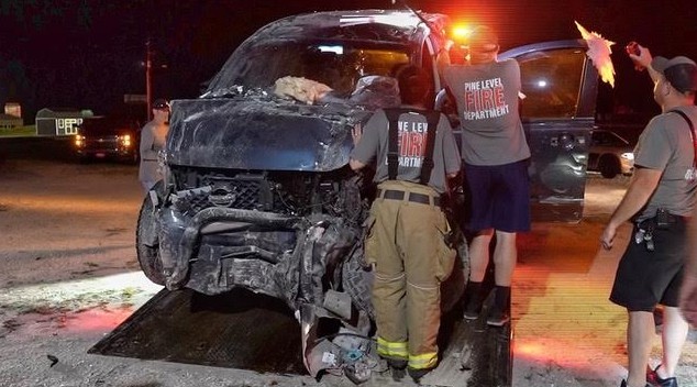 PINE LEVEL – The driver of a pickup truck, returning from a fishing trip at the coast, reportedly fell asleep at the wheel while westbound in the 3200 block of US 70 and drove deep into the Ignite Bible Fellowship Church in Pine Level, early Sunday.