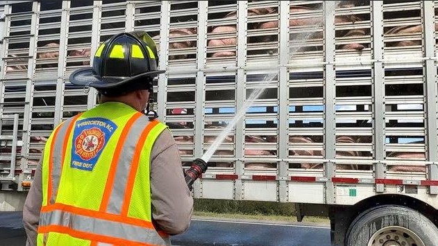 The truck was carrying a load of hogs at the time. Two animals were found deceased inside the trailer following the crash.