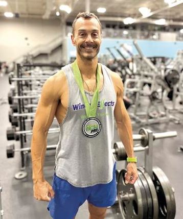 Back home, Neal Eichhorn stands with his medal inside Gold’s Gym in Fuquay-Varina where he trains six days a week. Dunn Daily Record Photo by Denise Galloway